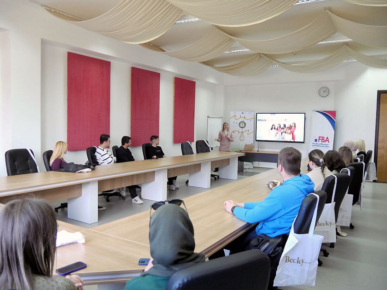 Doç Dr. Azra Ahmić ve Yrd Doç Dr. Šejma Aydin, finans, muhasebe veya denetime ilgi duyan orta ve son sınıf öğrencilerine hitap eden Emlak Piyasası dersinin bir parçası olarak bu konferansı düzenlemiştir. Derste Becky.works'ün derinlemesine sunumu, muhasebe ve finans üzerine tartışmalar ve etkili bir CV hazırlama, LinkedIn'i kullanma ve iş görüşmelerinde başarılı olma gibi olumlu iş başvuruları için temel ipuçları yer almıştır. Ayrıca Becky.works temsilcileri dağıttıkları hediyelerle katılımcıları memnun ederek bu eğitici etkinliğe unutulmaz bir dokunuş katmıştır. Bu ilgi çekici oturum sadece Becky.works'ün işleyişi ve tarihçesine derinlemesine bir bakış sunmakla kalmamış, aynı zamanda öğrencilere paha biçilmez bir rehberlik sağlayarak onları işgücüne daha yatkın olmaları için hazırlamıştır.